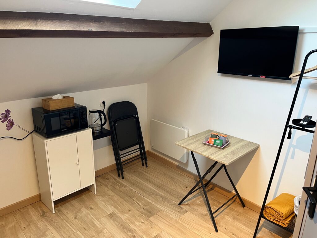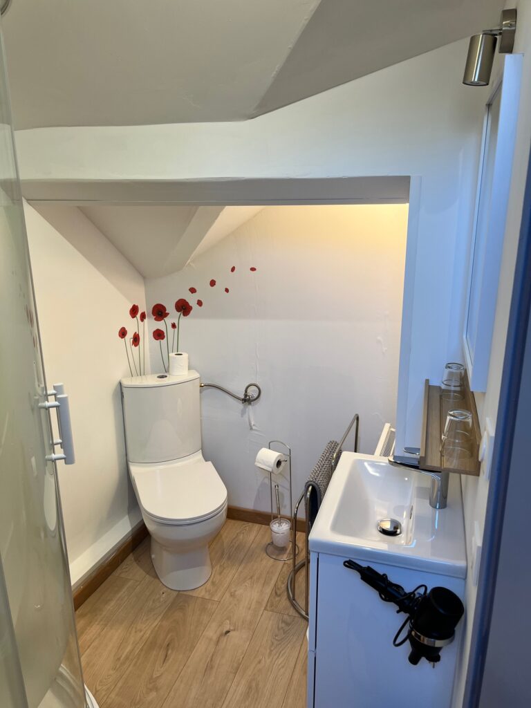 Idéale pour une ou deux nuitées. Une charmante petite halte entre deux étapes. Située à l’étage, elle a accès à note terrasse au rez-de-chaussée. Elle a le confort des autres chambres à savoir salle de bain privative, micro-onde, vaisselle pour 2, sèche cheveux, serviettes fournies.